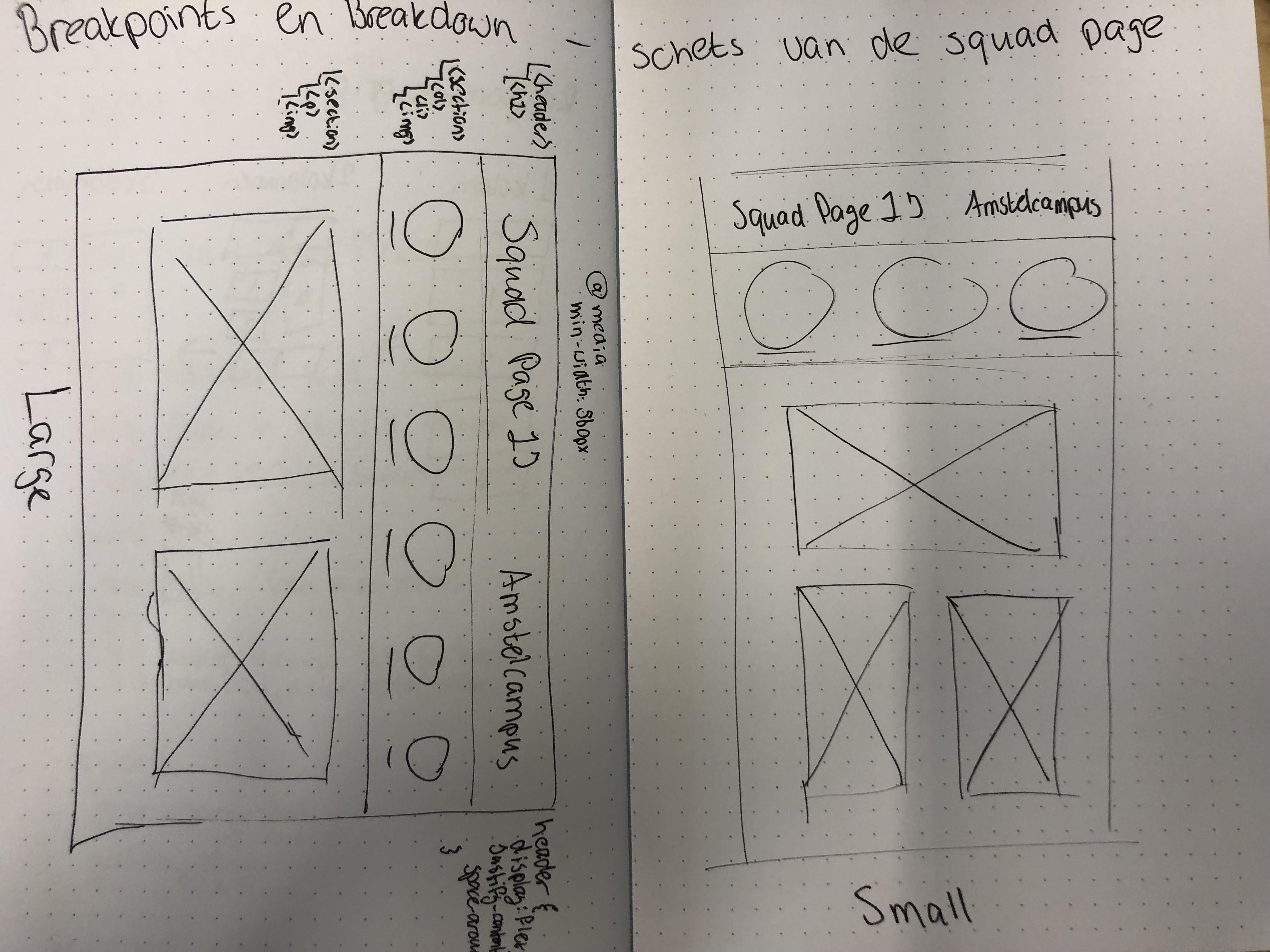 Sprint planning en Workshop Squad Page: Introductie Squad Page, begin Sprint planning gemaakt, 'Ontwerp squad page' issue aangemaakt met alle (breakdown)schetsen.