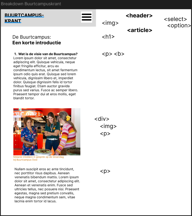 Verder werken aan je opdracht en vragen stellen over van prototype naar HTML: Breakdown-schets gemaakt.