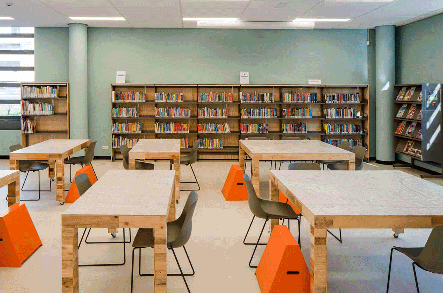 Rinke: 'Als je binnenkomt op de Buurtcampus, moet je niet het idee hebben dat je een klassieke bibliotheek binnengaat. De oude bieb was een verzameling grijze boekenkasten, het was er stil, en de nadruk lag op de collectie. Dat wilden we anders voor de Buurtcampus: we wilden dat deze plek meer zou fungeren als “huiskamer van de stad”. En dat is aardig gelukt.'